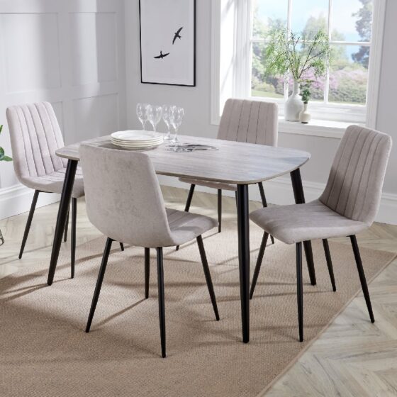 Revamp your dining area with the Furniture in Fashion Arta Rectangular Grey Wooden Dining Table, beautifully Pack Of 4 with 4 contemporary Natural Straight Chairs. This elegant dining set seamlessly combines style and functionality, making it the perfect choice for both family dinners and casual gatherings. The sleek grey wooden finish of the table offers a modern aesthetic, while the striking Natural chairs add a refreshing pop of colour, creating a vibrant focal point in any dining space. Designed to fit comfortably in a variety of settings, the Arta Rectangular Dining Table provides ample space for meals, crafts, or work-from-home tasks. The sturdy construction ensures durability, while the stylish design makes it a versatile addition to any home. This dining set is not just about looks; its also built for everyday use, making it the ideal choice for contemporary living. Elevate your dining experience with the Furniture in Fashion Arta Rectangular Grey Wooden Dining Table with 4 Natural Straight Chairs, where modern design meets practicality, making it an ideal choice for todays stylish homes. FEATURES : Dining Table Material : Wooden Dining Table Finish : Grey Oak Dining Chair Material : Fabric Dining Chair Finish : Natural The sleek grey finish adds a modern touch, enhancing various decor styles in your home Offers generous surface area for dining, perfect for family meals and entertaining guests Featuring a minimalist design, these chairs provide comfortable seating with a chic pop of colour Made from high-quality materials, ensuring longevity and stability for everyday use The compact design of this set makes it a perfect fit for apartments, kitchens, or dining nooks The smooth surfaces of both the table and chairs allow for quick cleaning and upkeep This dining set is suitable for dining rooms, casual breakfast areas, or even as a stylish workspace Available at an affordable price Images shown are for illustration purpose only DIN