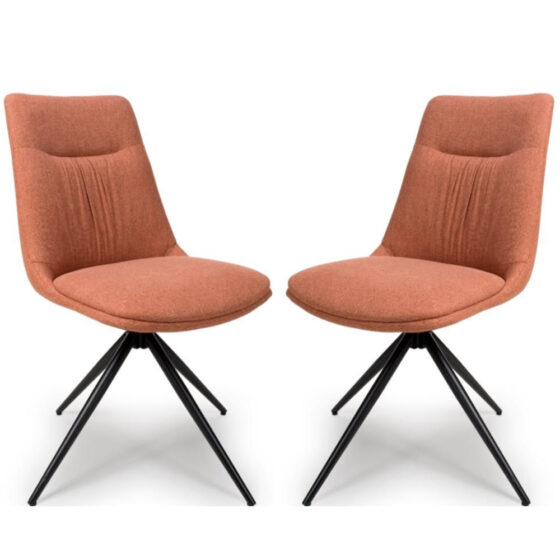 Introduce effortless style and modern functionality to your dining area with the Furniture in Fashion Buxton Brick Swivel Fabric Dining Chairs In Pair. Upholstered in a warm and striking brick-toned fabric, these chairs bring contemporary charm to any interior. Perfectly suited for modern kitchens or dining rooms, the sleek design offers a blend of elegance and practicality thats ideal for everyday living or entertaining guests. Featuring a smooth swivel mechanism, these chairs allow for flexible movement and dynamic seating, while the cushioned seat and curved backrest ensure superior comfort. Supported by sturdy black metal legs, this stylish pair is not only a visual highlight but also built for lasting durability. Bring functional flair and bold sophistication to your dining experience with the Furniture in Fashion Buxton Brick Swivel Fabric Dining Chairs In Pair. Designed for both comfort and style, these chairs are the perfect statement piece for your contemporary home. FEATURES : Material : Fabric, Metal Finish : Brick, Black All dressed in Easy Clean fabric offering practicality, comfort and style and made to complement a host of interior styles and spaces Polyester / Cotton sponge / Conical tube black matt leg 360 degree turntable Set of 2 Swivel Dining Chairs Ideal for modern kitchen or dining setups Striking Brick-Coloured Fabric Upholstery Adds warmth and bold style 360 Swivel Mechanism Offers enhanced functionality and easy movement Comfortably Padded Seat and Curved Backrest Ensures excellent support Sleek Black Metal Legs Provide stability and an industrial edge Versatile Modern Design Complements various decor styles Available at an affordable price Images shown are for illustration purpose only DIMENSIONS : Height : 880mm Width : 470mm Depth : 605mm