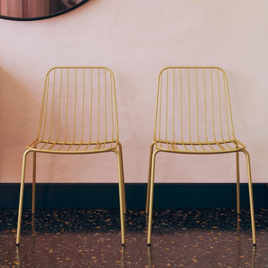 Add a touch of industrial elegance to your dining space with the Furniture in Fashion Cedar Gold Metal Dining Chairs In Pair. These sleek and modern chairs are designed to bring both style and durability to your dining room, kitchen, or caf-style setting. With their bold Gold finish and minimalist structure, the Cedar chairs offer a contemporary aesthetic that complements a wide range of interiors. Crafted from high-quality metal, each chair provides strong support and lasting performance. The gently curved backrests and contoured seats offer comfort as well as style, making them ideal for everyday dining or entertaining guests. Whether used with a wooden, glass, or metal dining table, these chairs are sure to make a striking impression. The Furniture in Fashion Cedar Gold Metal Dining Chairs In Pair are the perfect blend of modern design and everyday functionality. With their sturdy build and chic Gold finish, theyre a stylish and practical addition to any dining area. FEATURES : Material : Metal Finish : Gold Simple and practical yet trendy, the Cedar Wire Dining Chair provides a modern and industrial design that can fit into any home decor Its sturdy metal wire frame ensures its longevity while its design provides the option to dress it up with a cushion to match the room aesthetic Cushion not included Modern and industrial design perfect for any home decor These chairs are stackable for easy storage No assembly required Curved backrests Provide ergonomic support and enhanced comfort Compact and lightweight Easy to move and ideal for smaller spaces Low-maintenance finish Simple to clean and care for Versatile styling Complements a variety of dining tables and decor styles Fully assembled or easy assembly Quick setup for immediate use Available at an affordable price Images shown are for illustration purpose only DIMENSIONS : Height : 787mm Width : 559mm Depth : 508mm