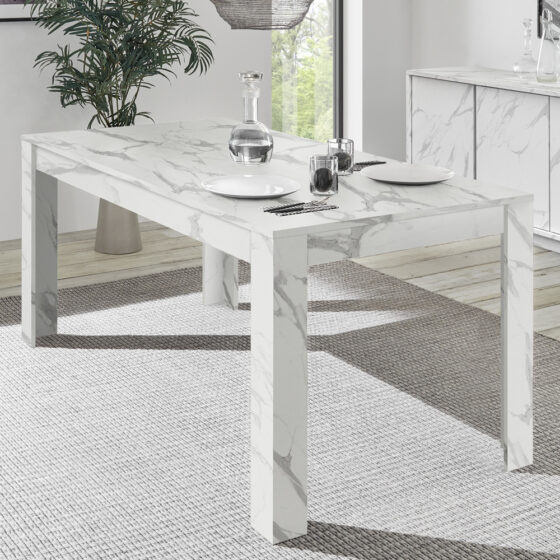 The Furniture in Fashion Corvi Wooden Rectangular Dining Table in White Marble Effect is the epitome of elegance and sophistication. Crafted with a sturdy wooden base and a stunning White marble effect table top, this dining table adds a luxurious touch to any dining space. The sleek design and high quality finish make it a perfect centrepiece for both modern and contemporary interiors. Designed for both functionality and style, the Corvi dining table provides ample space for family meals and social gatherings. Its durable construction ensures longevity, while the White marble effect surface adds a timeless aesthetic that complements various dcor styles. FEATURES : Material : FSC Certified Wood Finish : White Marble Effect Durable and sturdy base for long lasting use Adds a luxurious and sophisticated look Offers ample space for dining and entertaining Resistant to stains and scratches Complements a variety of interior styles Accommodates multiple guests with ease Ensures durability for everyday use Quick and hassle free setup with clear instructions Available at an affordable price Images shown are for illustration purpose only DIMENSIONS : Height: 79cm Width: 180cm Depth: 90cm