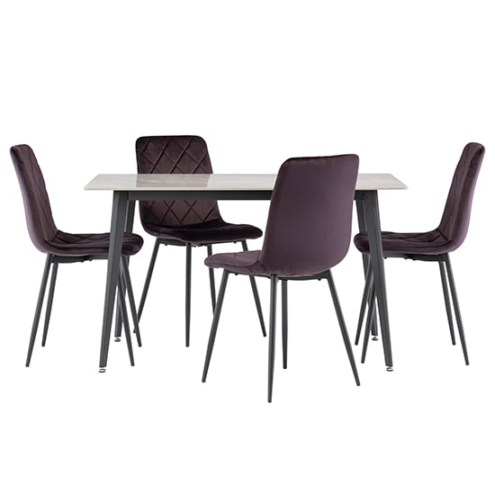 Inbar 130cm Grey Marble Dining Table 4 Basia Aubergine Chairs