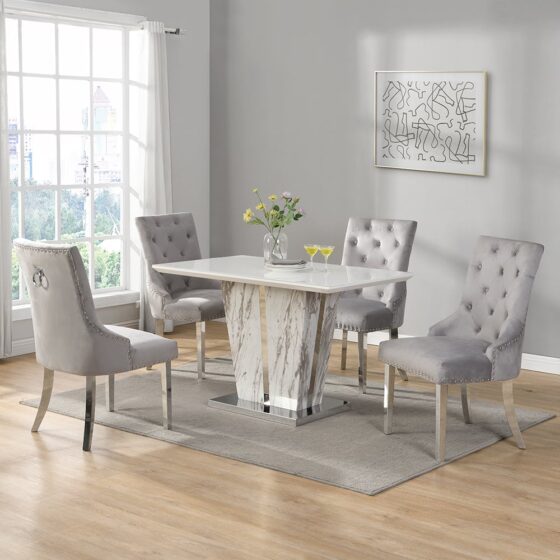 Transform your dining area into a haven of modern elegance with the Furniture in Fashion Memphis Filo Effect Small Dining Table and 4 Imperial Grey Chairs set. This exquisite ensemble combines sophisticated design with practical comfort, making it an ideal centrepiece for gatherings and everyday meals alike. Crafted with attention to detail, the Memphis dining table features a stunning Filo marble effect finish paired with a spacious table top, offering both style and functionality. Accompanied by Four Imperial Grey chairs, upholstered for luxurious comfort and durability, this set promises to elevate your dining experience. Revitalize your dining room with the Memphis Filo Effect Small Dining Table and 4 Imperial Grey Chairs set from Furniture in Fashion, combining timeless elegance with practical design. Whether hosting guests or enjoying meals with family, this set ensures both style and comfort for memorable dining moments. FEATURES : Material : Filo Marble Effect And Glass Top Finish : Grey And White High Gloss Elegant Filo Marble Effect Finish : Adds a touch of luxury and sophistication Spacious Table top : Generous surface area for dining and entertaining Sturdy Construction : Built with high-quality materials for durability Imperial Grey Upholstery : Stylish and comfortable chairs for long dining sessions 4 Imperial Grey Chairs Dining Chairs With Velvet Fabric Contemporary Design : Modern aesthetic that complements various interior styles Versatile Seating : Suitable for family dinners, parties, or formal gatherings Easy Maintenance : Smooth surfaces for effortless cleaning and upkeep Available at an affordable price Images shown are for illustration purpose only TABLE DIMENSIONS : Height : 74cm Width : 120cm Depth: 70cm CHAIR DIMENSIONS : Height : 102cm Width : 54cm Depth : 72cm Seat Height : 52cm Seat Depth : 51cm