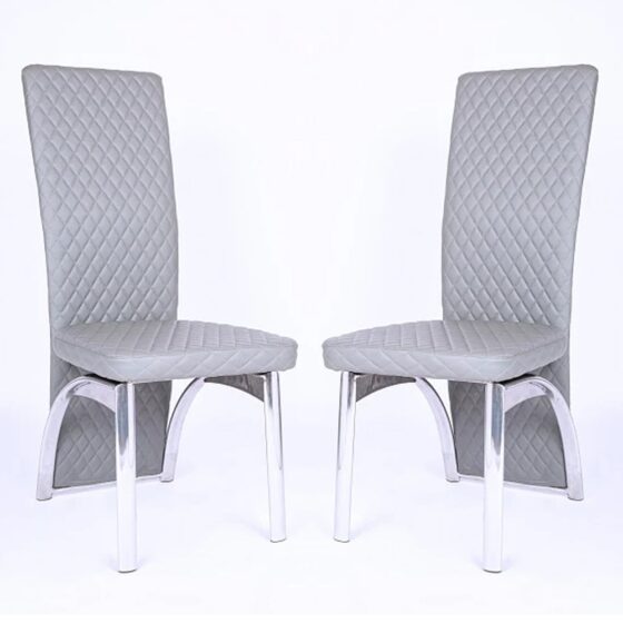 Enhance your dining experience with the Pooler Grey Faux Leather Dining Chairs by Furniture in Fashion. Designed to combine elegance and comfort, these modern dining chairs feature a sleek Grey faux leather upholstery that effortlessly complements any dining space. The sturdy chrome frame adds a contemporary touch while ensuring durability and stability. Whether for everyday meals or special gatherings, these chairs provide a sophisticated seating solution for your home. Crafted with high-quality materials, the Pooler Dining Chairs offer a luxurious look and feel while being easy to maintain. The ergonomic high backrest and padded seat provide excellent support, making them perfect for long dinner conversations. With their versatile and stylish design, these chairs seamlessly blend into various interior styles, from modern to classic. Upgrade your dining area with this chic and functional chair set that guarantees both comfort and durability. FEATURES : Material : PVC, Faux Leather, Aluminium Finish : Grey, Chrome Modern Style PVC covered, chrome frame, comfortable thick pad foam seat Strong Aluminium stylish frame legs and high back panel base This comes exactly as shown in picture (assembling required) This Chair is perfect for any living room, dining room, office, or reception area Ideal for dining rooms, kitchens, or as stylish accent chairs Soft, durable, and easy to clean Provides lasting strength and modern appeal Available at an affordable price Images shown are for illustration purpose only DIMENSIONS : Height : 108cm Width : 44cm Depth : 45cm